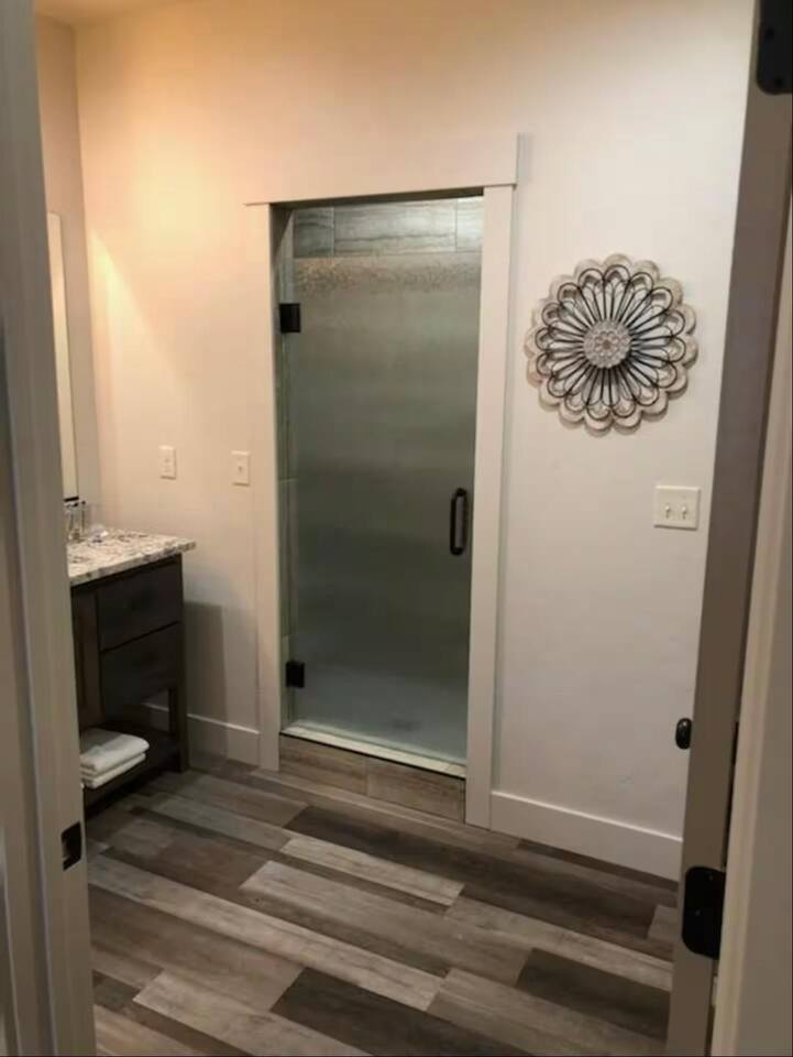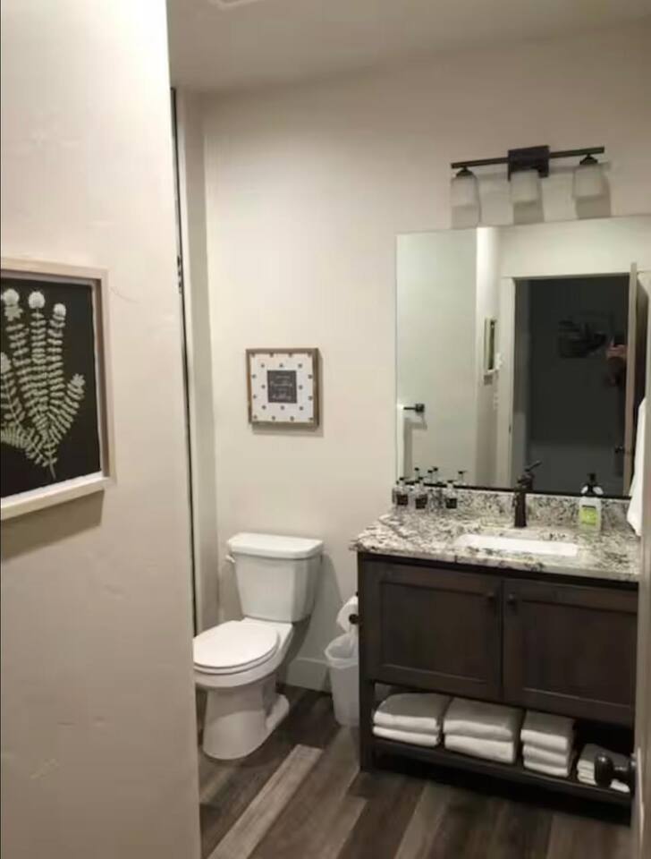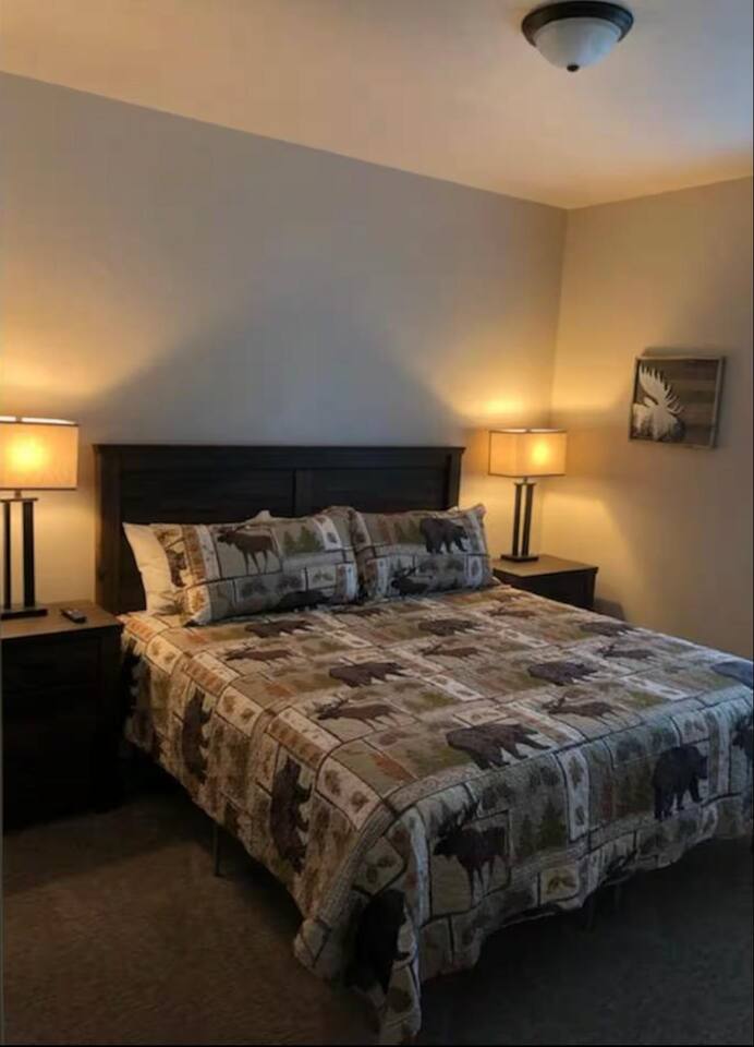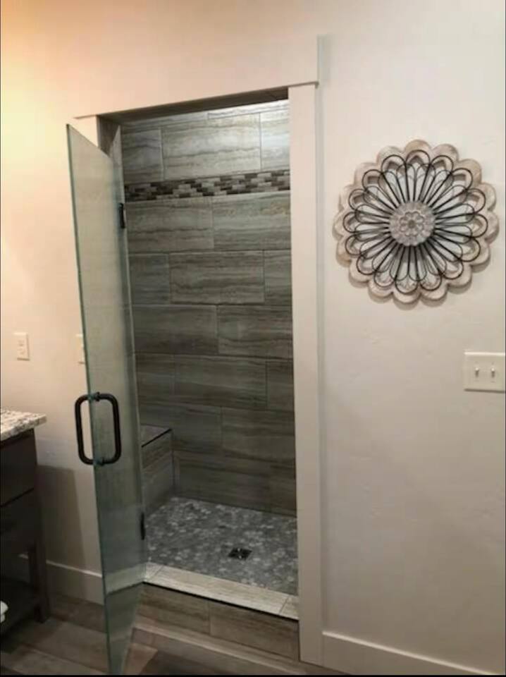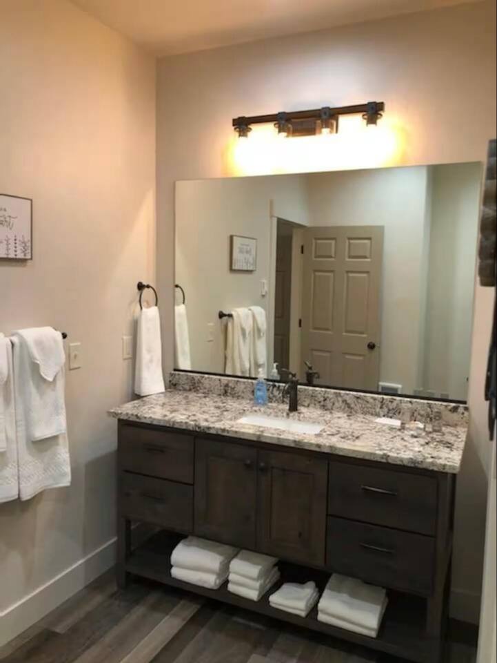 New Summer 2020 - 2 bed, 2 bath cabin. - Suite 1: King bed, 55" Smart TV and closet, private bath with walk-in tiled shower - Suite 2: King Bed, 55" Smart TV and closet, bath with tiled tub/shower. Fully equipped kitchen with full sized fridge, range, oven, dishwasher, microwave, coffee machine, toaster, and blender. Also has dining area for six. Living room has fireplace, 65" Smart TV, and queen sleeper sofa. Free WiFi Sleeps 6