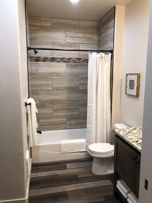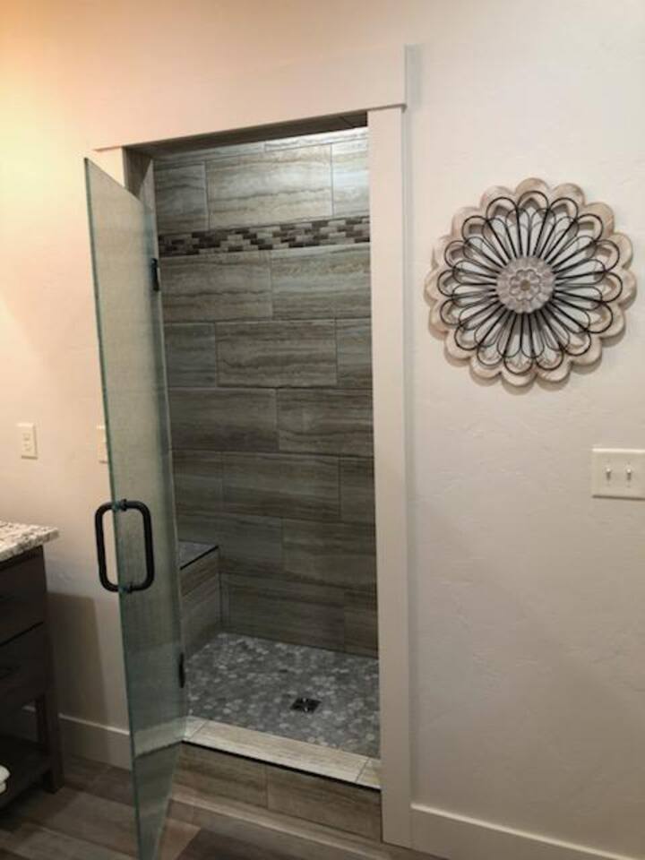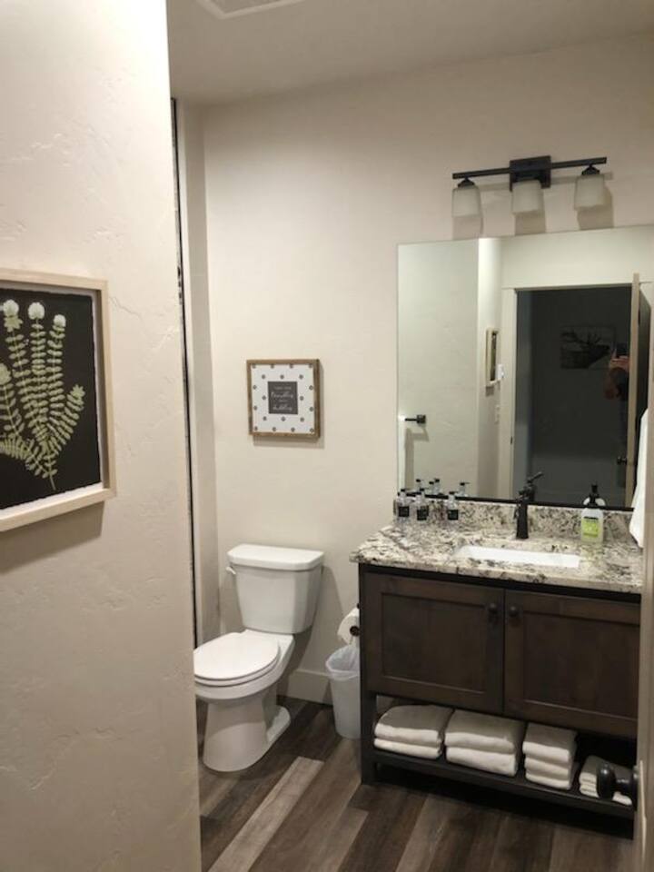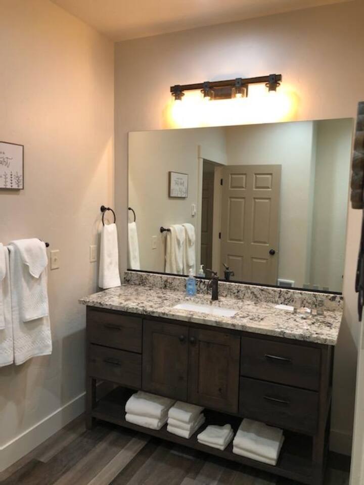 New Summer 2020 - 2 bed, 2 bath cabin. - Suite 1: King bed, 55" Smart TV and closet, private bath with walk-in tiled shower - Suite 2: King Bed, 55" Smart TV and closet, bath with tiled tub/shower Fully equipped kitchen with full sized fridge, range, oven, dishwasher, microwave, coffee machine, toaster, and blender. Also has dining area for six. Living room has fireplace, 65" Smart TV, and queen sleeper sofa. Free WiFi Sleeps 6